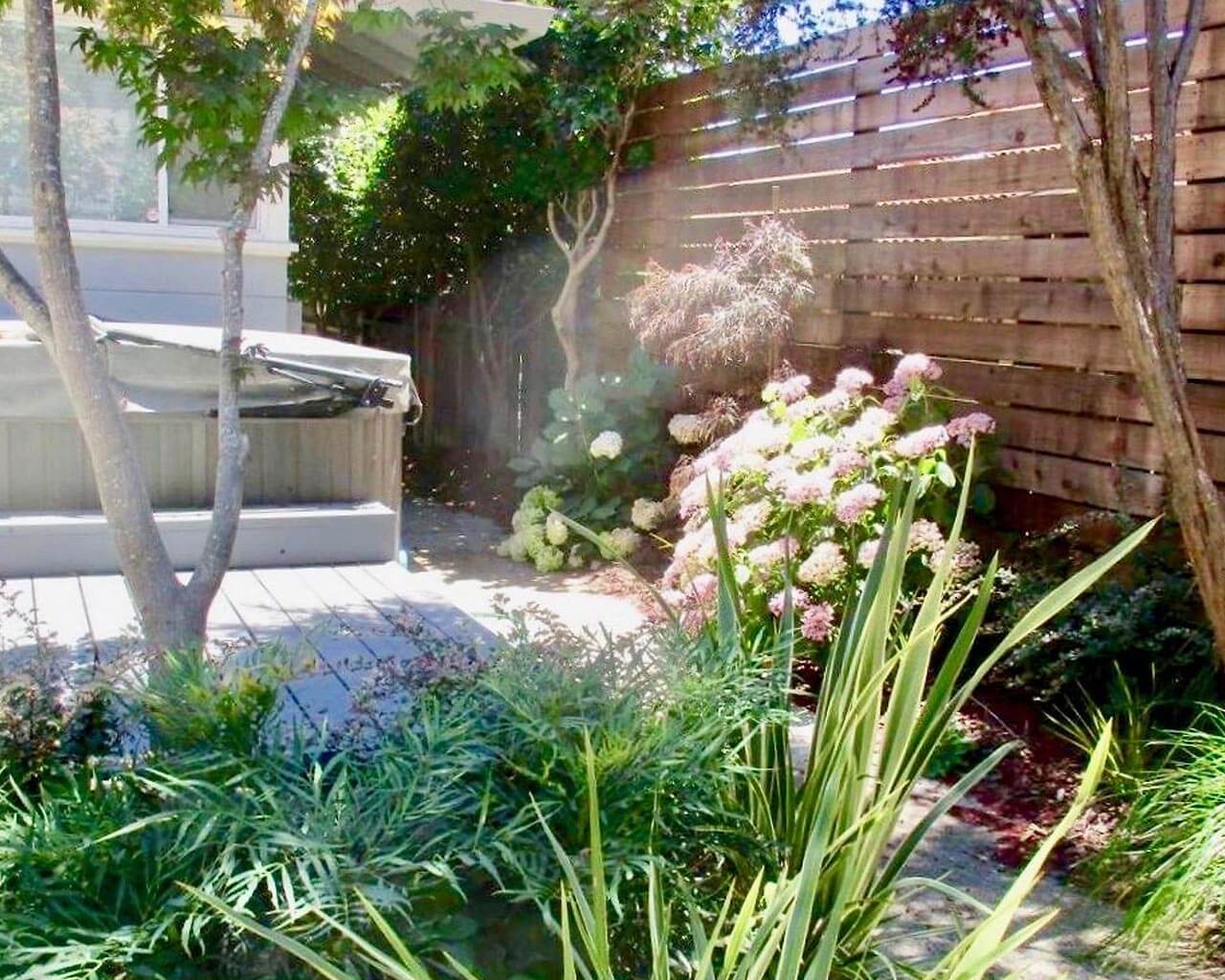 Two-year project: The first year we replaced existing fencing, gates and removed 1970s overgrown shrubs and trees. For the new landscape, a modern perimeter fence, a new entry way and gate, and a mix of Mediterranean and California native plantings. The second year, we redesigned the interior courtyard, demolished the front yard’s outdated picket fence and brick paving, and installed a flagstone patio, tall plant screen of different foliage textures, and enclosed the front landscape with a modern designed fencing.