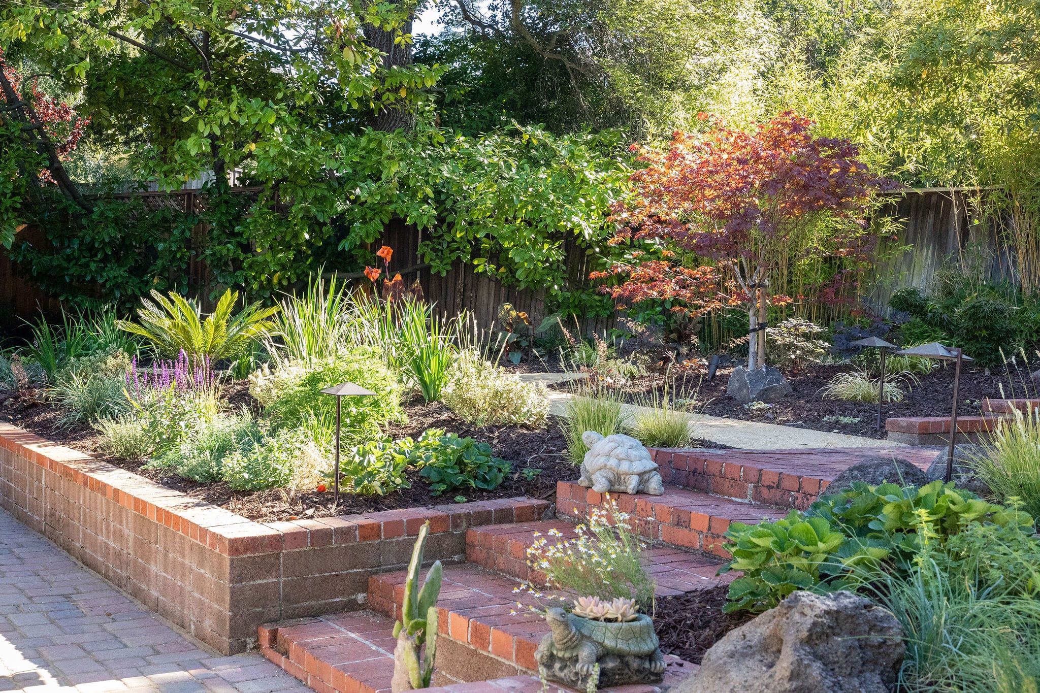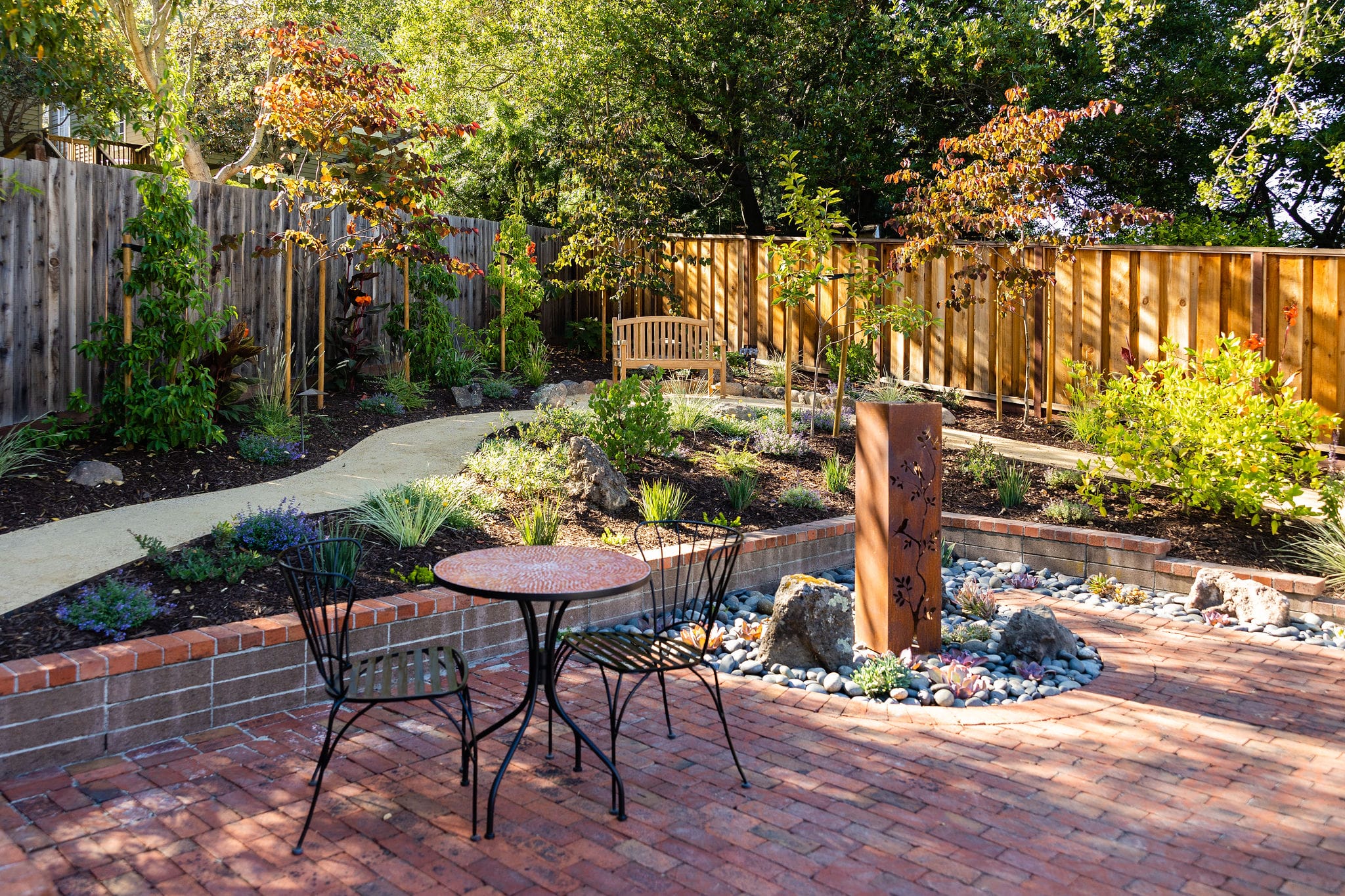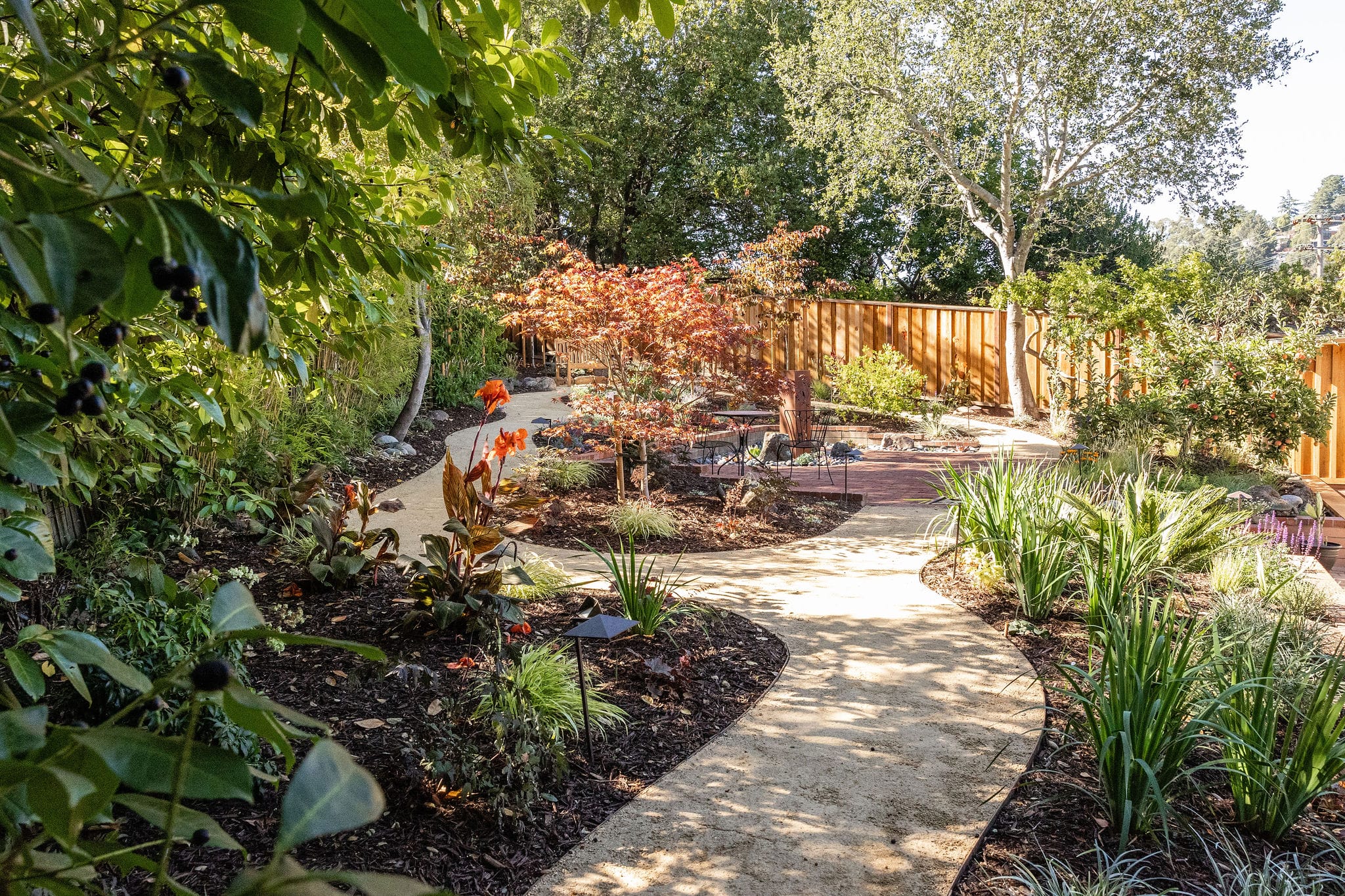 This Montclair backyard landscape design showcases our expertise in creating immersive garden experiences and circulation flow. The winding trail transformation features a thoughtfully placed bench destination surrounded by layered plantings and decorative elements.