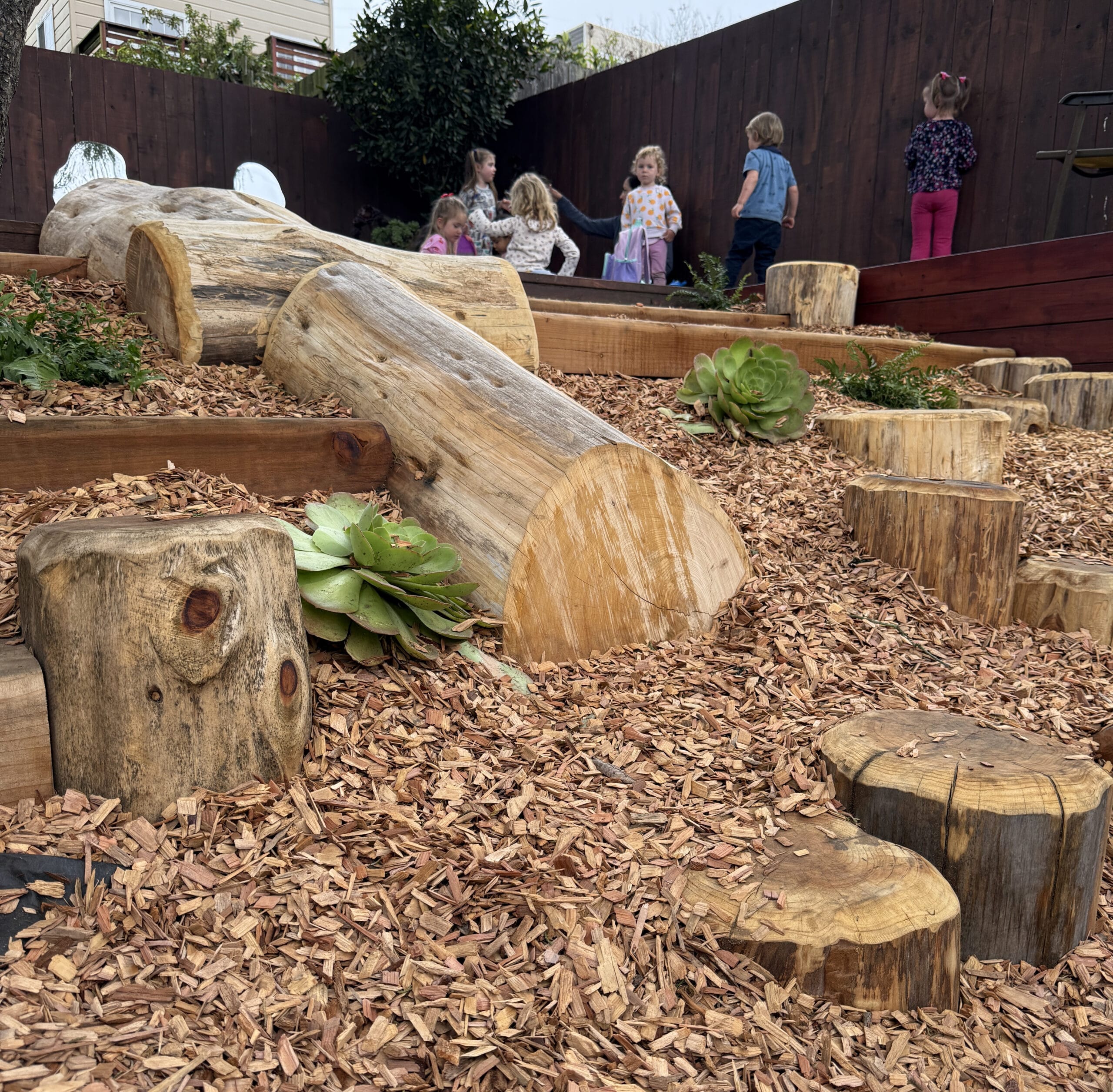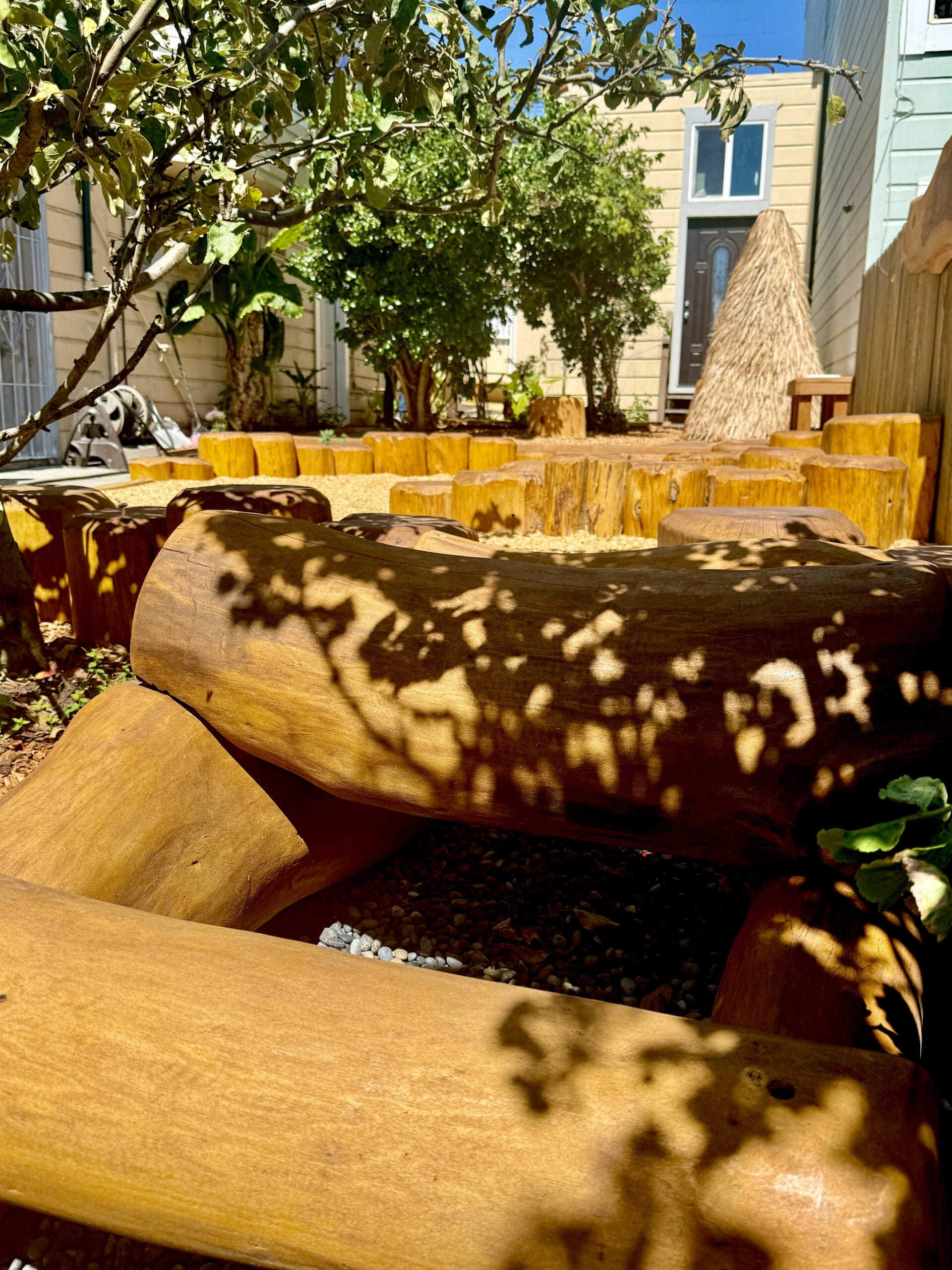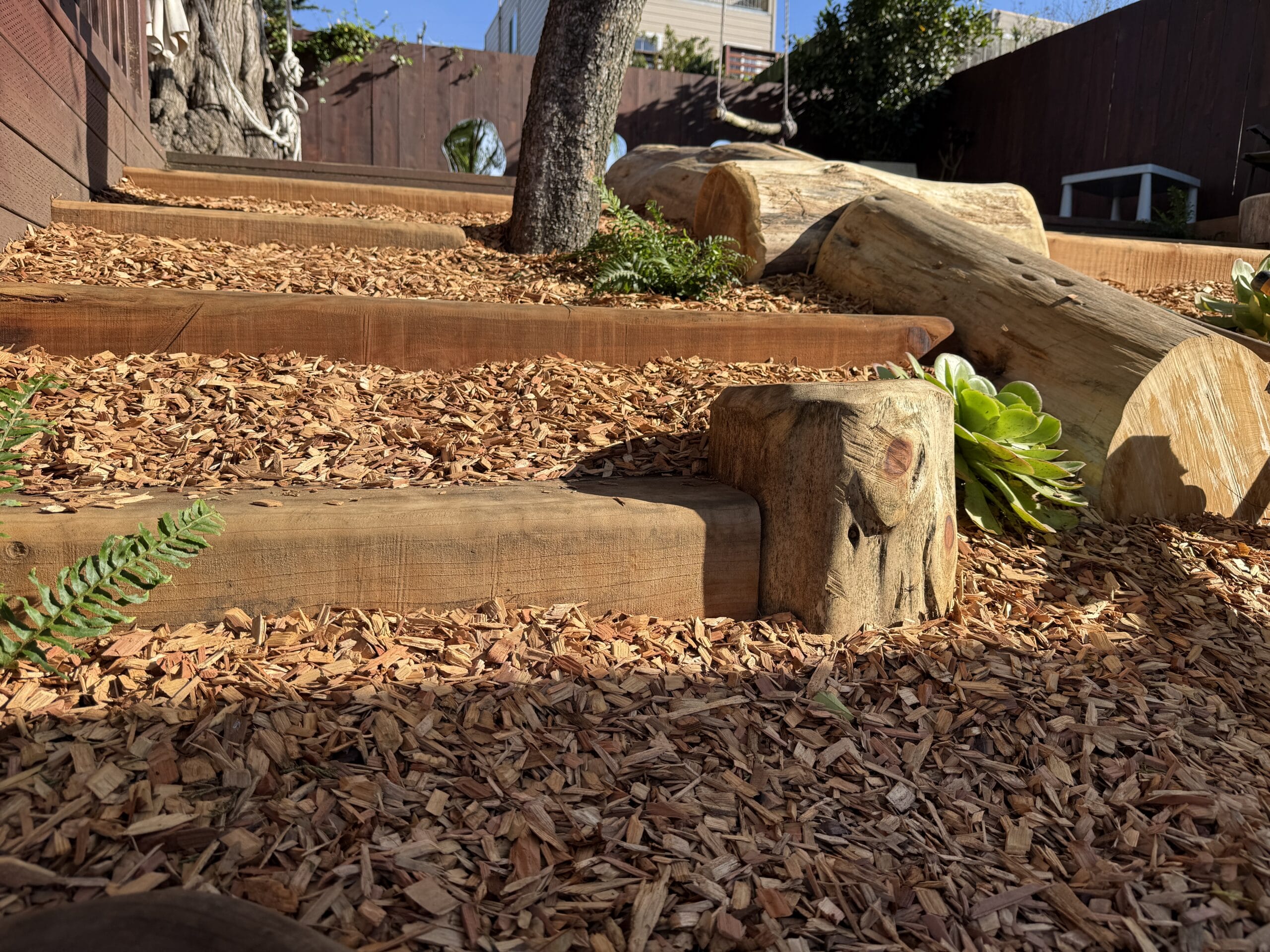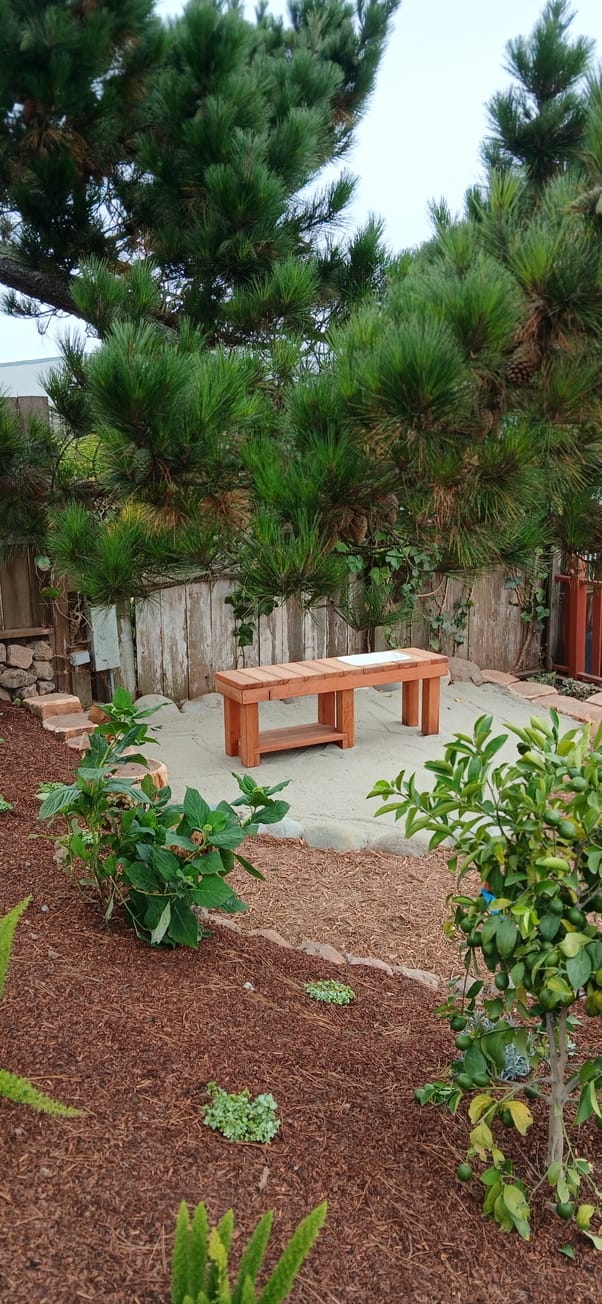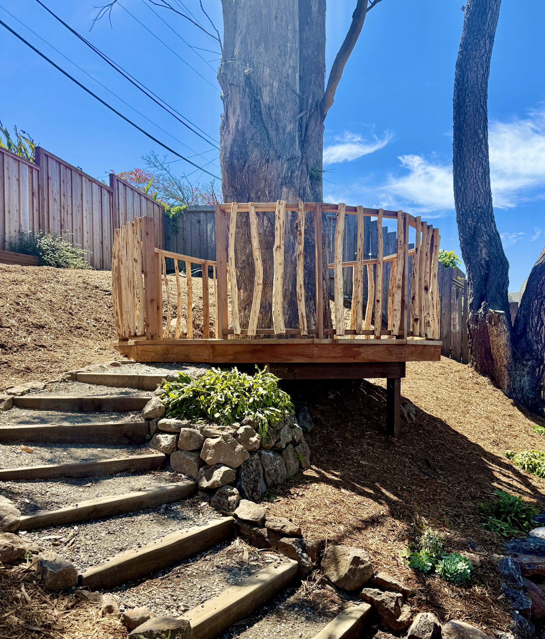 This Oakland Rockridge landscape design showcases our expertise in intimate gathering spaces and urban backyard retreats. The cozy transformation features a custom fire pit, comfortable seating arrangement with beach chairs and cement bench, surrounded by exceptional landscaping design.